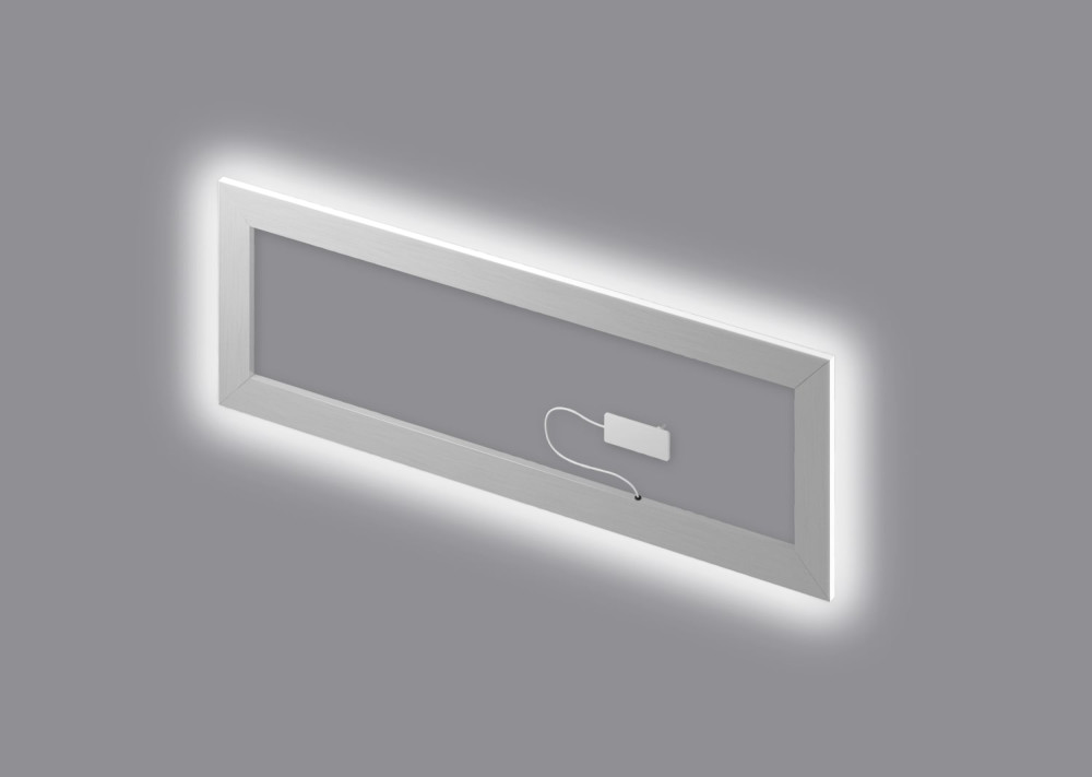 Aluminium bakgrunnsramme med integrert LED belysning for Arstyl Wallpanels dekor plater. Systemet er komplett med transformator, LED belysning og deksel.